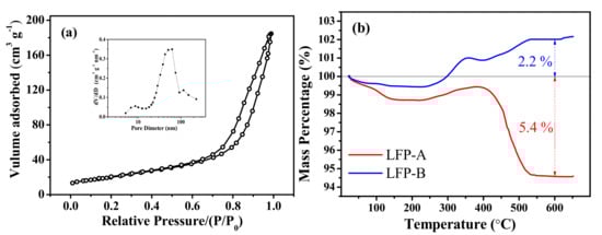 (a) Nitrogen adsorption-desorption isotherm curve of LFP-A sample; and (b) TG curves of the samples with a heating rate of 10 °C min−1 in air.