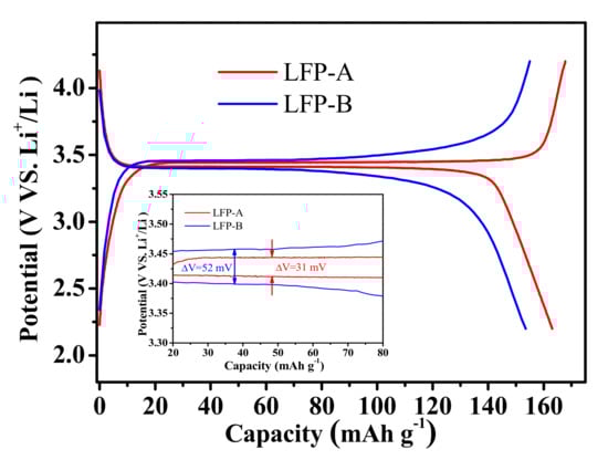 The samples were tested as a cathodic material for lithium ion rechargeable batteries. The loading of electrode material is ca. 1.73 mg cm−2, with a 8:1:1 weight ratio of LiFePO4/C, acetylene carbon black and poly(vinylidene fluoride). The electrode area is 1.67 cm2 with a density of around 1.2 g cm−3. The charge/discharge curves of the synthesized LFP samples are shown in Figure 5. LFP-A composite delivers a high specific capacity of 163 mAh g−1 at 0.1 C-rate (29.5 × 10−3 mA cm−2) with a long and flat plateau, which is 95.9% of the theoretical capacity (170 mAh g−1). While the LFP-B sample delivers a relatively lower capacity of 153 mAh g−1. The LFP-A shows a smaller voltage difference of ca. 31 mV between the charge and discharge plateaus which means it has smaller polarization, i.e., the interfacial electrostatic behavior of the hollow microspherical LiFePO4/C composite excel that of the nanosized spindle-like LiFePO4/C, which exhibits a voltage difference of ca. 52 mV.