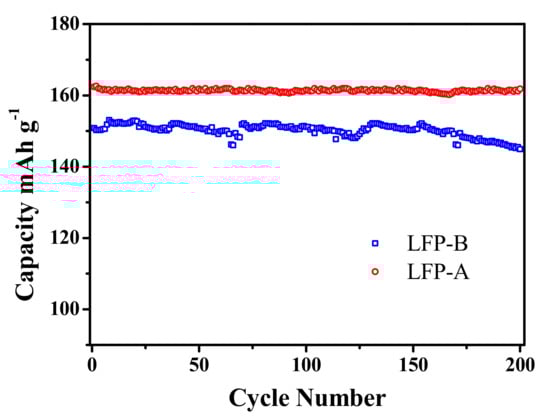 The cycling performance of the two samples measured between 2.0 and 4.2 V at a current density of 0.1 C-rate (29.5 × 10−3 mA cm−2) are displayed in Figure 6. It can be seen that LFP-A and LFP-B samples both exhibit good capacity retention with continuous charge-discharge processes. The capacity of LFP-B sample declines from 152 mAh g−1 at the initial cycle to 145 mAh g−1 at the 200th cycle, with a capacity loss of 4.5%, while the capacity decay of LFP-A sample after 200 cycles is only 0.8%. The sample composed of hollow microspheres exhibits a better cycling performance, which can be attributed to the microporous hollow spherical structure increasing the contact area between the active materials and the electrolyte.