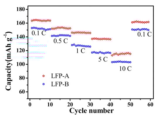 Charge and discharge tests at various current rates ranging from 0.1 C to 10 C were performed and the results are shown in Figure 7. The LFP-A sample exhibits a superior rate performance, and capacities as high as 163, 152, 145, 137, and even 118 mA h g−1 could be obtained at 0.1, 0.5, 1, 5, and 10 C rates, respectively. The reversible capacity can be recovered and maintained 161.9 mA h g−1 when the current rate was again returned to 0.1 C. The corresponding values of the sample synthesized without CTAB are 154, 142, 125, 117, and 102 mA h g−1, respectively. The microspherical secondary architecture of hollow LiFePO4/C is, hence, suggested to be more favorable for the diffusion of both electrons and ions.