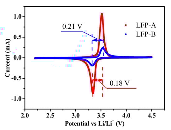 To obtain more information on the electrochemical properties of the two samples, cyclic voltammetry (CV) tests were carried out at a scanning rate of 0.1 mV s−1 in the potential range of 2.2–4.5 V. As shown in Figure 8, the LFP-A sample showed a more symmetric shape and sharper peak profiles. It exhibits a pair of anodic and cathodic peaks at 3.52 V and 3.34 V, respectively, resulting in a potential shift of 0.18 V. In the case of the LFP-B composite synthesized without CTAB, the anodic and cathodic peaks were found at 3.54 V and 3.33 V, respectively, with a potential shift of 0.21 V. These peaks correspond to the extraction and insertion of lithium ions and the smaller potential shift illustrates a weaker polarization and possibly an easier kinetic process for LFP-A. It can also be found that the current flow at redox peaks of LFP-A is higher than that in the LFP-B sample. The anodic/cathodic current peaks of LFP-A were about 1.1 mA, while the value for the other sample was about 0.2 mA. These peaks correspond to the extraction and insertion of lithium ions. According to the Randles-Sevcik equation [40], it can be concluded that the Li+ ion diffusion in the hollow spherical LiFePO4/C is faster than that in the spindle-like LiFePO4/C.