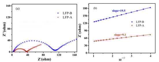 where Zre represents the real part of the resistance in the low frequency region and is the corresponding frequency. The relationships between Z’ and the square root of frequency in the low-frequency region of the two samples are shown in Figure 9b. From the two curves, Li+ ion diffusion coefficients (D) of sample LFP-A and LFP-B electrodes are calculated to be 2.32 × 10−12 and 5.05 × 10−13 cm2 s−1, respectively. The result indicates that Li ion diffusion in LFP-A is nearly five times faster than that in LFP-B. The values of the diffusion coefficients for the two samples are higher than the literature value for pristine LiFePO4 (~10−14 cm2 s−1) [17]. This further confirms that the hollow micro-sphere structure is helpful to the rapid Li ion transport.