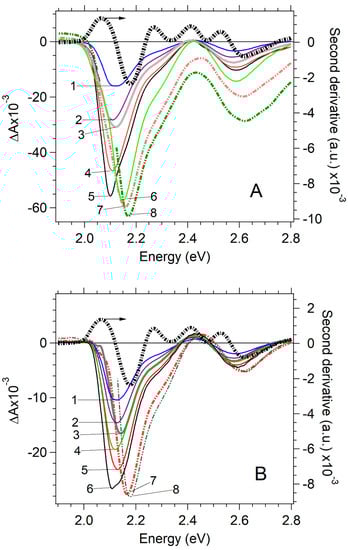 Dependence of transient absorption spectra of CdSe on the pump pulse fluence (left axis) at a short time delay of 100 fs and a long time delay of 500 ps. The second derivative of the CdSe absorption spectrum (black dashed line, right axis). Second derivative minimums demonstrate the position of exciton bands of the absorption spectrum. (A) Transient spectra at a time delay of 100 fs: 1, 0.042 mJ/cm2; 2, 0.064 mJ/cm2; 3, 0.085 mJ/cm2; 4, 0.18 mJ/cm2; 5, 0.25 mJ/cm2; 6, 0.35 mJ/cm2; 7, 1.06 mJ/cm2; 8, 1.8 mJ/cm2. (B) Transient spectra at a time delay of 500 ps: 1, 0.042 mJ/cm2; 2, 0.064 mJ/cm2; 3, 0.085 mJ/cm2; 4, 0.18 mJ/cm2; 5, 0.25 mJ/cm2; 6, 0.35 mJ/cm2; 7, 1.06 mJ/cm2; 8, 1.8 mJ/cm2.