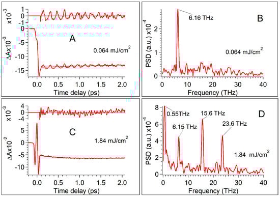 The significant difference between the oscillating curves obtained at low and high pump fluence (Figure 2B,D) suggests that the excitation of the LA phonon modes at 0.55 THz and the induction of coherent wave-packet dynamics of toluene at 15.6, 23.6 THz develop much steeper with increasing pump fluence than the amplitude of the LO phonon oscillations at 6.16 THz enhances. Figure 4 shows the dependence of PSD amplitude and Fourier transform spectra on the pump fluence. The oscillation of the coherent LO phonon dominates in the FFT spectrum at low pump fluences, while at high pump fluences, the oscillation amplitudes of the coherent LA phonon and toluene modes outstrip the oscillation magnitude of the coherent LO phonon. It is noteworthy that the dependence of the oscillation amplitude of the coherent LO phonon is non-monotonic vs. pump fluence (Figure 4). At low pump fluences, the amplitude of the oscillations increases, reaches a maximum, and at high pump fluences a decrease of the LO phonon amplitude is registered. The amplitudes of competitive modes (the coherent LA phonon at 0.55 THz and coherent wave packets in toluene at 15.6 THz and 23.6 THz) rise monotonically with increasing pump fluence. The linear growth of the coherent wave-packet amplitude of toluene is in accord with theoretical predictions and experimental observations [38,39]. The dependence of the coherent LO phonon amplitude vs. pump fluence shown in Figure 3A was unexpected for us, because this dependence exhibits the maximum. The wavelet transform of LO phonon oscillations reveals striking details of the spectral and temporal structures of the LO phonon at different pump fluences and allows a deeper understanding of the electron-phonon coupling in QDs.