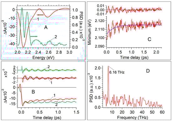 Figure 3 shows the main effects associated with the manifestation of oscillations of coherent LO phonon wave packets at low pump energy when oscillations at 15.6 THz and 23.6 THz do not perturb transient traces. A power spectral density (PSD) spectrum calculated by the FFT of residuals at different probe wavelengths shows extremums for coherent LO and LA phonon wave packets. The PSD spectrum of the LA coherent phonon of 0.55 THz manifests a maximum at 594 nm (see the 3D-presentation of PSD (ν, λ) in SI3, Figure S5). Electron-phonon coupling of LA phonons in bulk and nanocrystal QDs was studied previously [5,6,7,8,9,10,15,18,23,41]. In the present work, LA phonons are not analyzed in detail. Figure 3A demonstrates the PSD (ν = 6.16 THz) spectrum of coherent LO phonon oscillations. It manifests two global extremums in the region of the [1S(e)-1S3/2(h)] bleaching band at 2.087 eV (594 nm) and 2.186 eV (567 nm). Figure 3B shows oscillations in transient traces at probe wavelength 2.087 eV (594 nm) and 2.186 eV (567 nm). Figure 3B also demonstrates the residuals of these transient traces and their fitting by damped oscillating function A·exp(−t/τdamp)·sin(ωt + ϕ) according to the χ2 criteria.