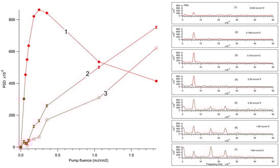 Dependence of the oscillation amplitude in transient traces at 567 nm on the pump fluence. (Left) 1. The oscillation amplitude of the coherent LO phonon at 6.16 THz; 2. The oscillation amplitude of the coherent longitudinal acoustic (LA) phonon at 0.55 THz; 3. The oscillation amplitude of the toluene wave packet at 15.6 THz. (Right) The dependence of PSD spectra, revealed by the FFT of oscillation components, on the pump fluence: (1) 0.042 mJ/cm2; (2) 0.106 mJ/cm2, (3) 0.18 mJ/cm2, (4) 0.25 mJ/cm2, (5) 0.35 mJ/cm2, (6) 1.06 mJ/cm2, (7) 1.84 mJ/cm2.