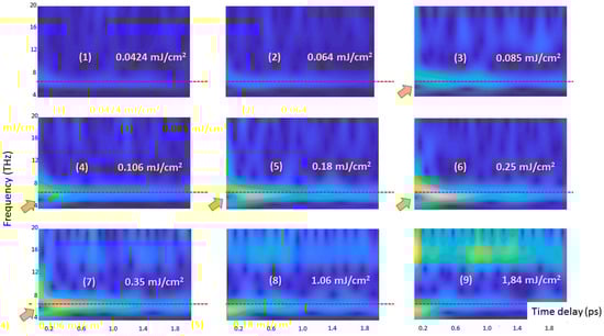 Oscillation intensity distribution by continuous wavelet transform (CWT) in the frequency time domain. Transient traces at the probe wavelength of 567 nm were analyzed. The red dashed line indicates the position of the LO phonon at 6.15 THz as revealed by the Fast Fourier Transform (FFT). Arrows indicate the destructive interference spot. The colormap is the same for all 2D plots revealing the dependence of CWT intensity on pump fluence. Pump fluence: (1) 0.0424 mJ/cm2; (2) 0.064 mJ/cm2; (3) 0.085 mJ/cm2; (4) 0.106 mJ/cm2; (5) 0.18 mJ/cm2; (6) 0.25 mJ/cm2; (7) 0.35 mJ/cm2; (8) 1.06 mJ/cm2; (9) 1.84 mJ/cm2.