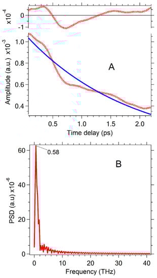 (A) Decay of the CWT amplitude corresponding to the coherent LO phonon. Pump fluence is 0.106 mJ/cm2. The blue solid line indicates the exponential fit: exp(−t/τCWT) The time decay τCWT is equal to 1.8 ± 0.2 ps. (B) FFT of residuals shown in Figure 6A.