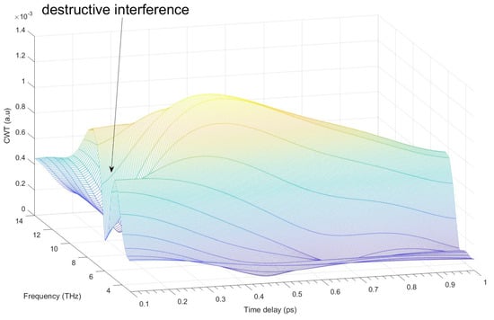 Destructive interference. Spectrogram calculated by CWT corresponding to the transient trace at 567 nm measured at the pump fluence of 0.18 mJ/cm2. The 3D plot shows a frequency region around the oscillation of the coherent LO phonon.