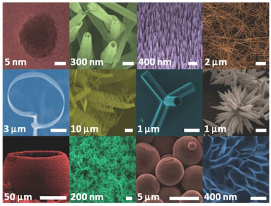 Among the metal oxides, zinc oxide (ZnO) is one of the most investigated because of its versatility and multi-functionality. Actually, ZnO on its own possesses very interesting physical and chemical properties that make it a suitable candidate for a huge number of applications, ranging from optics to environmental science, biomedicine and electronics [25,26,27]. Besides that, the versatility of ZnO is also due to the existence of numerous morphologies showing very high specific surface areas [28,29]. These structures, some of which are presented in Figure 1, lie in the micrometer-to-nanometer scale and may include compact and nanobranched thin-film structures [30,31], nanoparticles (NPs) [32], nanowires (NWs) [33,34], nanotubes [35], nanobelts [36], nanorings [37], flower-like morphologies [38], multipods [39] and tetrapods [40]. Additionally, all these ZnO micro- and nanostructures may be very easily prepared by following various synthetic approaches.