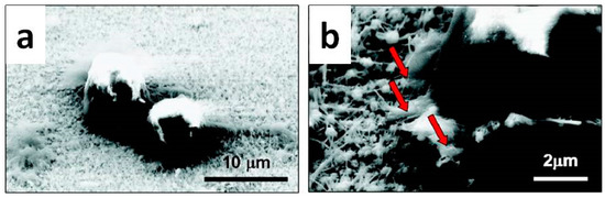 Scanning electron microscopy (SEM) images of HeLa cells on ZnO nanowire (NW) arrays. (a) Two HeLa cells grown on the surface of ZnO NW arrays; (b) Cells are upheld by the nanowires (NWs). Some ZnO NWs are phagocytosed into the HeLa cell (pointed out by the red arrow). The diameter and the length of the nanowires are ~100 nm and ~1.5 μm, respectively. Adapted with permission from reference [87]. Copyright (2008) American Chemical Society.