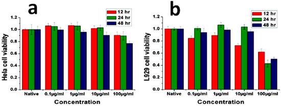 Cell viability tested by the MTT (3-(4,5-dimethylthiazol-2-yl)-2,5-diphenyltetrazolium bromide) method as a function of ZnO NW concentration and time. (a) Cell viability of the HeLa cell line in the MTT test, cultured with different concentration of ZnO NWs for 12 h, 24 h, 48 h; (b) Viability of L929 cell line in the MTT test, cultured with different concentrations of ZnO NWs for 12 h, 24 h, 48 h. Adapted with permission from reference [87]. Copyright (2008) American Chemical Society.