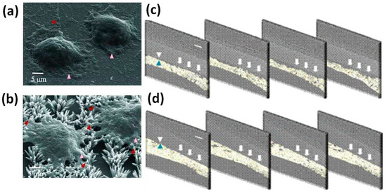 Panels (a,b): Scanning electron microscopic images of MC3T3-E1 osteoblasts grown on (a) ZnO film and (b) ZnO nanoflowers after cultivation for a day. Lamellipodia and filopodia were indicated with pink and red arrowheads, respectively. Panels (c,d): sequential synchrotron X-ray tomographic images of regenerated bones to (c) ZnO film and (d) ZnO nanoflowers on ZnO film-coated silicon substrate implanted in the calvarial bone defects of rats for four weeks. Arrows (▲ or ▼) indicate the interface between ZnO surface and the regenerated bone exhibiting the topographic effect of ZnO nanoflowers on osseointegration. Scale bars correspond to 100 μm. Modified with permission from reference [15]. Copyright (2010) John Wiley & Sons, Inc.