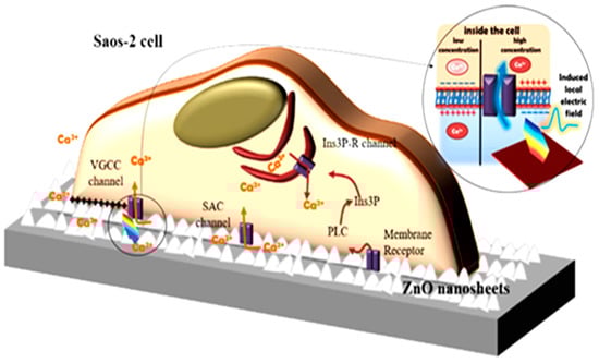 As previously mentioned, ZnO nanostructures have been widely investigated also for their promising piezoelectric properties [55,76,90]. The use of ZnO nanomaterials as nanogenerators (NGs) could thus be envisioned, finding widespread application in new generation energy harvesting systems and nanosensors [91,92]. Very recently, ZnO NGs have been successfully tested also for the electrical stimulation of cells. Living human cells (macrophages and osteoblast-like Saos-2 tumor cells) were cultured on ZnO nanosheets (NSs), and their mutual interaction was investigated [93]. The aim, sketched in Figure 5, was to demonstrate how the mechanical forces excercised from the living cells on the underlying piezoelectric ZnO nanosheet array could induce the rise of a local electric field, and how this local field affected the biological behavior of the grown cells.