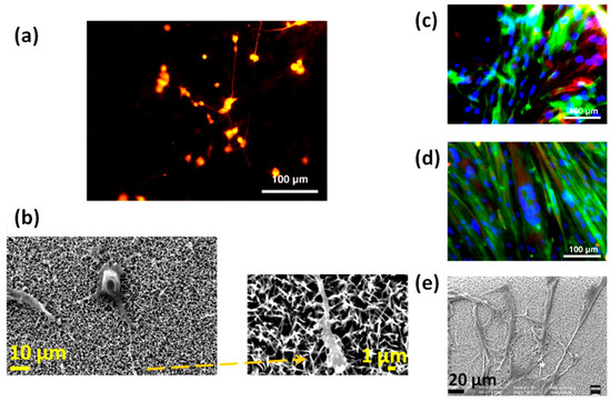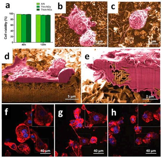 Biocompatibility of the thin- and thick-nanogenerators (NGs) and control aluminum nitride (AlN) for macrophages. (a) Cytotoxicity was analyzed by the live/dead kit at 2 and 5 days of culture. No differences were found among the samples and time-points analyzed (χ2 test); (b,c) Cell morphology and NG–cell interaction, assessed by scanning electron microscopy and focus ion beam after 2 days in culture, showed that macrophages adhered to both (b) thin and (c) thick NGs; (d,e) The plasma membrane was in direct contact with the (d) thick NGs and some macrophages even appeared to have engulfed the (e) thin NGs. (f–h) Confocal laser scanning microscopy images of actin filament (red) detection showed that the distribution of stress fibers was similar on cells grown on (f) AlN; (g) thin NGs; and (h) thick NGs (see the enlarged area). The nuclei are stained in blue with DAPI dye. Scanning electron micrographs were false-colored for better visibility, depicting macrophages (magenta) and nanogenerators (yellow). Modified with permission from reference [93]. Copyright (2017) John Wiley & Sons, Inc.