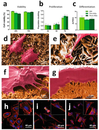 Biocompatibility of the thin and thick nanogenerators (NGs) and control aluminum nitride (AlN) for Saos-2 cells. (a) Viability was analyzed by the live/dead kit at 24 and 72 h of culture; (b) Proliferation by the Alamar Blue assay at 1, 2, 3, and 7 d; (c) Differentiation by a quantitative analysis of alkaline phosphatase activity (ALP) activity, a differentiation osteoblast marker, at 14 days of culture. No significant differences among materials were observed for any of those parameters (χ2 test and Kruskal–Wallis test); (d,e) Morphology and NG–cell interaction, assessed by scanning electron microscopy (SEM) and focused ion beam (FIB), showed that cells were firmly adhered to the nanosheets (NSs) (d) and emitted long projections that were anchored to the NSs (e); (f,g) Cells were completely adapted to the topography of the NSs (f), which were in direct contact with the plasma membrane (g); (h–j) Confocal laser scanning microscopy analysis after immunodetection of vinculin (focal contacts, green) and detection of actin (stress fibers, red) showed a high number of focal contacts at the end of long parallel bundles of actin filaments on cells grown on AlN, displaying a polygonal shape (h). The nuclei are stained in blue with DAPI dye. Shorter actin bundles and less focal contacts were present in cells grown on thin NGs (i) and thick NGs (j), which also displayed a more elongated, spindle-shape morphology (see the enlarged area). Scanning electron micrographs were false-colored for better visibility of the Saos-2 cells (magenta) and the nanogenerators (yellow). Modified with permission from reference [93]. Copyright (2017) John Wiley & Sons, Inc.