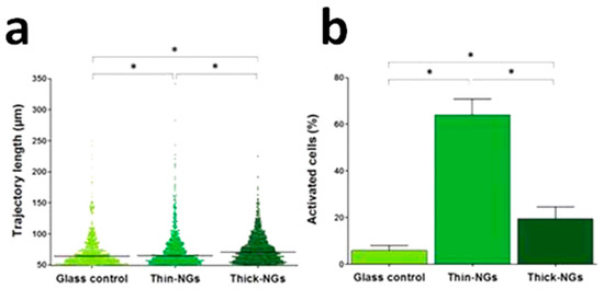 Effect of the thin- and thick-nanogenerators (NGs) on macrophages and Saos-2 cell activity. (a) Macrophage motility quantified as trajectory lengths. Distances shorter than 50 μm were considered in situ motions; (b) Quantification of Saos-2 cells undergoing changes in Ca2+ concentration (activated cells). Asterisks (*) above the columns indicate significant differences between data sets, according to Kruskal–Wallis test and χ2 test. Modified with permission from reference [93]. Copyright (2017) John Wiley & Sons, Inc.