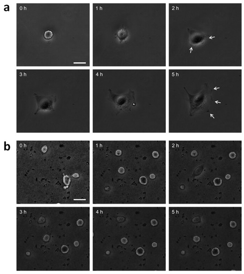 Dynamic cell spreading is altered by nanorods. Phase contrast imaging of human umbilical cord vein endothelial cells (HUVECs) spreading on glass and ZnO nanorods. (a) Cell spreading HUVECs is accompanied by lamellipodia formation (white arrows) and is complete in approximately 5 h; (b) Cells on nanorods do not spread, and do not develop any lamellipodia. Scale bar is 20 μm. Modified with permission from reference [14]. Copyright (2008) Elsevier.