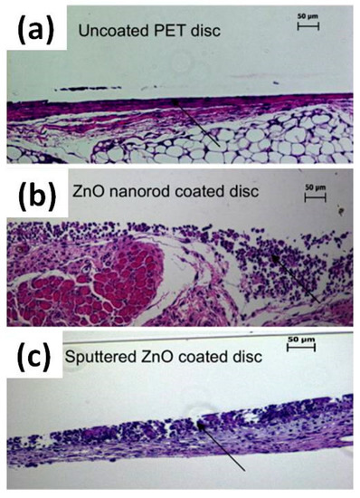 The nanotopography and cytotoxicity of ZnO NRs and sputtered films on macrophages was further investigated by Zaveri et al. [94]. Bone marrow-derived macrophages were cultured on ZnO NRs. Despite initially adhering to and spreading over ZnO NRs, a retraction of lamellipodia appeared after 2 h together with the appearance of totally round-shaped macrophages after 3 h. Moreover, evident protrusions containing actin started to be present after 6.5 h, suggesting cytoplasmic leakage. Cell viability was also considered. After 16 h, the number of viable cells was significantly reduced compared to flat ZnO and the control sample, suggesting that nanotopography played a central role in determing cell viability. In particular, the total number of adherent living cells was 52% and 12% of the flat ZnO and control sample, respectively. The mechanism inducing cell death was also investigated. It was found that, independently of the surface nanostructure, i.e., NRs or flat ZnO thin film, most of the cells underwent necrosis, while only 1% were involved in apoptosis. This suggested that, beyond nanotopography, ZnO cytotoxicity played a key role in determining cell death. To further elucidate this last aspect, the same cells were cultured in the presence of leachates due to the dissolution of ZnO into Zn ions. After exposing the cells to a culture medium that was previously in contact with both the ZnO NRs and thin films, i.e., medium containing ZnO leachates, a decrease in cell viability of around 50% to that obtained for the control sample was observed after seven days. This demonstrated that both ZnO nanotopography and cytotoxicity played a key role in determining cell viability, modulating in this case macrophage adhesion and viability. In vivo analyses were also carried out. Subcutaneous implantation of polyethylene terephthalate (PET) discs coated with both sputtered ZnO thin film and NRs was performed for 14 days in mice. Histological analyses of the explanted discs are shown in Figure 11 and unveiled the formation of high levels of accumulated leukocytes together with the lack of a continuous fibrous capsule only in the case of ZnO-coated PET discs. These factors demonstrated the presence of unresolved inflammation and further confirmed the in vitro results of the study.
