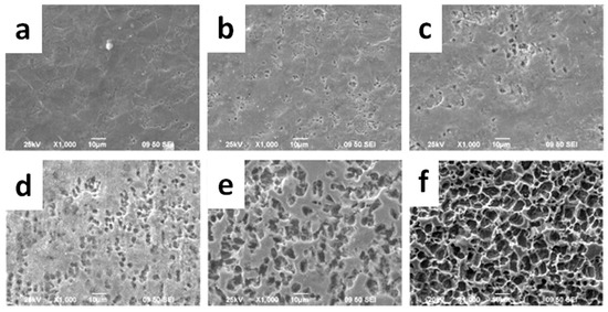 SEM images of zinc oxide films with different pore densities prepared by the anodic oxidation technique using different oxidation times. (a) 2 min; (b) 5 min; (c) 10 min; (d) 15 min; (e) 90 min; (f) 120 min. Modified with permission from reference [95]. Copyright (2011) Elsevier.