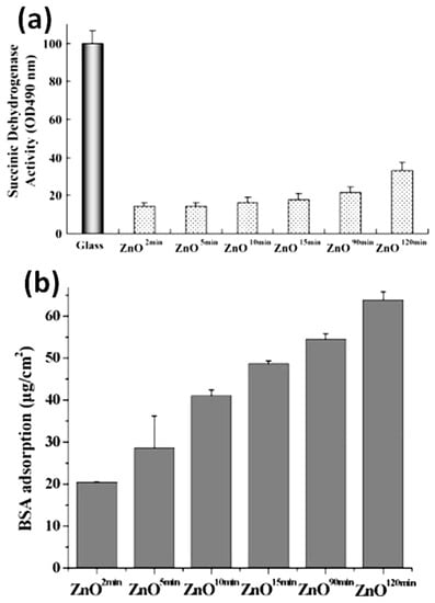 (a) Metabolic activity of NIH 3T3 cells cultured on ZnO films with different pore densities determined by the MTT method based on SDH activity. Cells were seeded at 104 cells/cm2 and allowed to proliferate for 48 h. The data were expressed as mean ± SD (n = 3); (b) BSA adsorption on porous ZnO films with different pore densities in 30 min. Modified with permission from reference [95]. Copyright (2011) Elsevier.