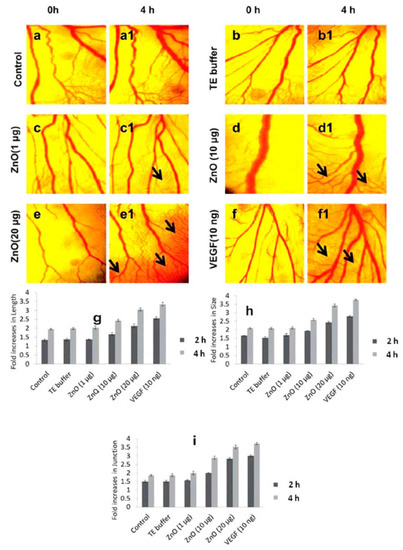 Chick embryo angiogenesis (CEA) assay with ZnO nanoflowers for in vivo angiogenesis assay. (a,a1) Untreated chicken egg yolks were considered as control; (b,b1) TE (Tris–Ethylenediamine Tetraacetic Acid) buffer; ZnO nanoflowers at different concentrations (1–20 mg) (c,c1,d,d1,e,e1); and vascular endothelial growth factor (VEGF) (10 ng) as positive control experiment (f,f1), respectively. A dose-dependent increase of matured blood vessel formation was observed with the increasing concentration of ZnO nanoflowers. The black arrows indicate the formation of new vasculature. Three angiogenesis parameters were quantified: vessel length (g); vessel size (h) and junction (i). Reproduced with permission from reference [20]. Copyright (2012) Royal Society of Chemistry.