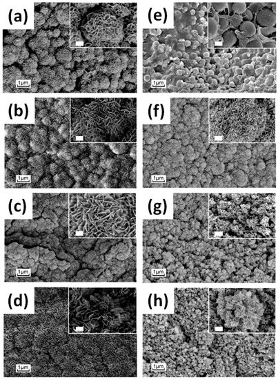 SEM images of the scaffolds after soaking in SBF, undoped scaffold: (a) 1 day; (b) 3 days; (c) 5 days; (d) 7 days; ZnO-doped scaffold: (e) 1 day; (f) 3 days; (g) 5 days; (h) 7 days. The insets are higher magnification (scale bar indicates 200 nm). Modified with permission from reference [103]. Copyright (2017) Elsevier.