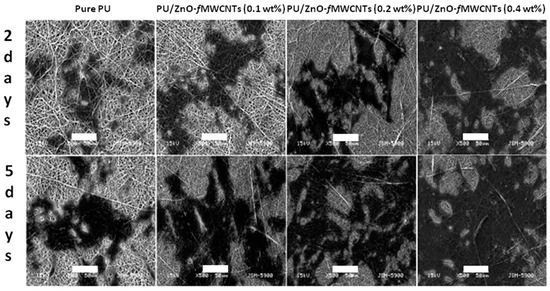 The incorporation of ZnO NPs, coupled with the presence of multiwall carbon nanotubes (MWCNTs), was found to effectively promote the osteogenic differentiation of pre-osteoblast MC3T3-E1, also in the case of polyurethane (PU) nanofibers [107]. After two, five and seven days of cell culture, the proliferation of cells was found to be 20.14%, 56.89% and 84.76% higher on PU–ZnO NPs-MWCNTs 0.4 wt % nanofibers than on the control PU sample. The SEM analyses shown in Figure 16 evidenced that pre-osteoblast cells spread more on the doped PU scaffolds, where a continuous increase in cell proliferation, differentiation and migration was obtained. Differentiation into osteoblasts was further confirmed by evaluating ALP activity and the secretion of collagen type I; in both the cases, the levels remarkably increased at seven and 14 days in the case of the hybrid PU nanofibers. Finally, the hybrid PU nanofibers significantly improved cell viability compared to pure PU nanofibers.