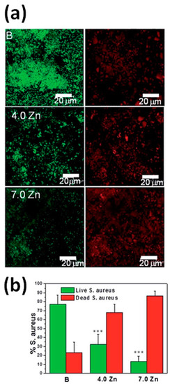 For example, the antimicrobial behavior of ZnO was exploited by Vallet-Regí and coworkers in ZnO-enriched SiO2–CaO–P2O5 bioactive glass scaffolds [106]. Staphilococcus aureus was considered a Gram-positive bacteria, responsible for infections in orthopedic surgery. The number of bacteria still viable after interaction with ZnO-doped glass scaffolds for two days was significantly lower with respect to the undoped control sample, as clearly visible from Figure 17. Moreover, bacteria viability strongly decreased (from 30% to 10%) by increasing the amount of ZnO within the glass scaffold from 4 to 7 mol %. These results were a clear indication that the incorporation of ZnO may lead to efficient antimicrobial properties for macro-mesoporous glass scaffolds. In particular, both ZnO incorporation and Zn2+ ion release prevented biofilm formation and effectively suppressed bacteria viability even for low concentrations of released Zn ions.