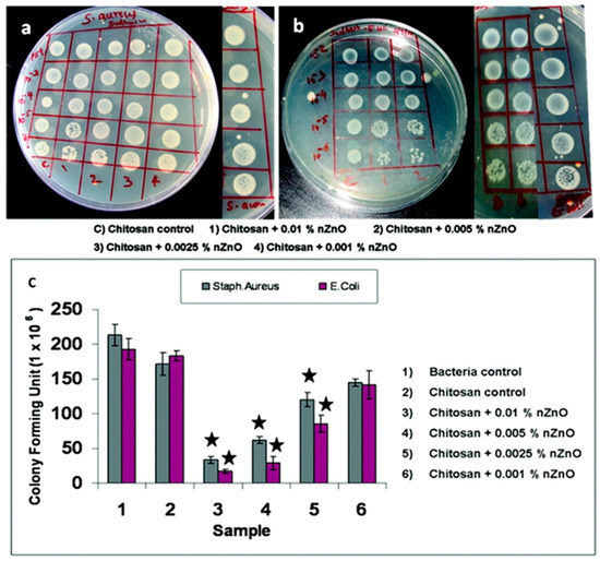Another study investigated both in vitro and in vivo the wound dressing and wound healing properties of chitosan hydrogel/ZnO NP composite bandages (CZBs) [24]. The authors first considered the effect of ZnO NPs on the in vitro biodegradation and antibacterial activity of CZBs. It was found that biodegradation of the overall hybrid structure was not altered by the presence of the NPs, while significant antibacterial properties against S. aureus and E. coli were achieved, as witnessed in Figure 18a,b by the appearance of inhibition zones around the doped samples during bacteria culture. Figure 18c also highlights that the antimicrobial activity was dose-dependent, being always remarkable in the presence of high amounts of ZnO NPs. The formation of ROS and Zn2+ release was considered the main factor in inducing antimicrobial activity, due to their aggressive action against the negatively-charged bacterial cell wall, inducing cell wall leakage and bacteria death.