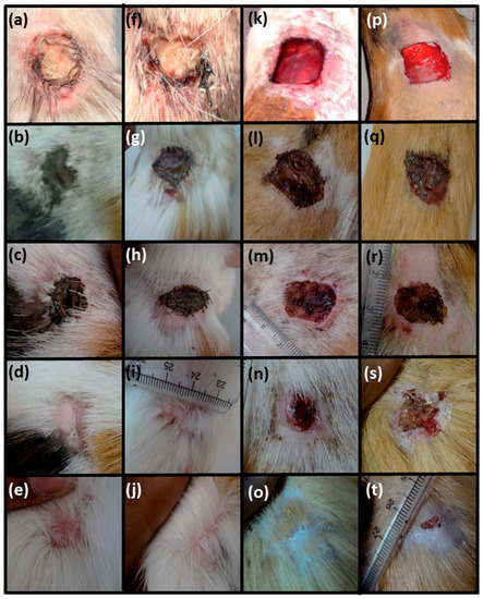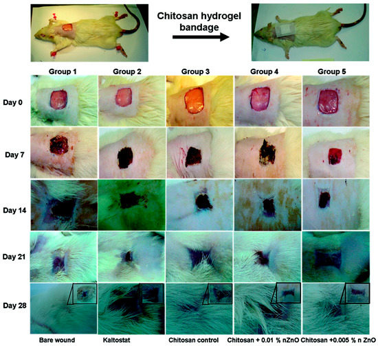 Photographs of an in vivo wound healing study. Note the extent of wound closure in the wounds treated with chitosan control and the chitosan hydrogel/ZnO NP composite bandages. Reproduced with permission from reference [24]. Copyright (2012) American Chemical Society.