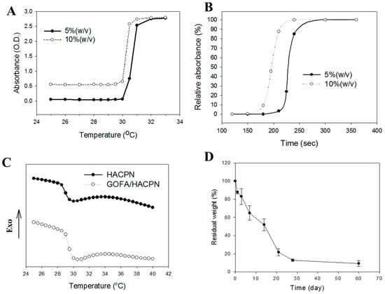 (A) Phase transition behavior of thermo-sensitive polymer HACPN at 5% and 10% (w/v) from 25 to 33 °C; (B) Kinetics of phase transition of 5% and 10% (w/v) HACPN solutions during heating with instantaneous temperature change from 25 to 37 °C; (C) Thermal properties of HACPN and GOFA/HACPN with 0.1% (w/w) GOFA from differential scanning calorimetry; (D) The weight loss of 10% (w/v) HACPN in pH 7.4 PBS at 37 °C.
