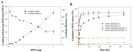 Drug loading and release behavior are the most important characteristics to evaluate a drug delivery system. Figure 4A shows the drug loading performance of GOFA. The high surface area and conjugate structure of GO could facilitate strong π–π stacking interactions with DOX and to achieve high DOX loadings []. By increasing the amount of DOX used during drug loading, the loading content (the weight of DOX to the weight of GOFA) of DOX increased sharply and reached as high as 25 mg DOX/mg GOFA when 3 mg DOX reacted with 0.1 mg GOFA. On the contrary, the DOX loading efficiency (the weight percentage of initial DOX bound to GOFA) decreased with increasing amount of DOX used and reduced from 95.5% to 37.6% when 3 mg DOX was used. Thus, reacting 2.0 mg DOX with 0.1 mg GOFA (DOX/GOFA = 20) was deemed the best condition for preparing GOFA-DOX considering both drug loading efficiency and loading content with the former being 51.2% and the latter being 14.2 mg/mg. It should be noted the DOX loading content reported here is much higher than the values (32 μg/mg and 1.84 mg/mg) reported previously using FA-conjugate carbon nanotubes [,]. For DOX loading to GO, the loading contents reported previously were 2.35 and 0.294 mg/mg [,]. These results indicated that GOFA is a highly efficient nano-carrier for loading and delivery of DOX.