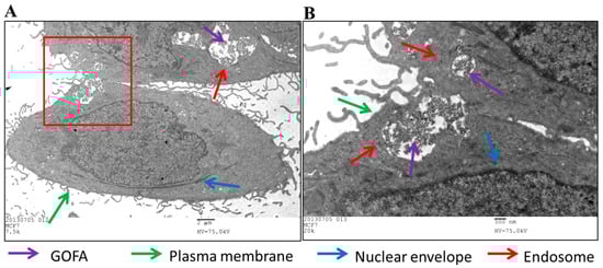 (A) Transmission electron microscope (TEM) micrographs of MCF-7 cells treated with GOFA for 1 h. (B) is an enlarged view of the square in (A). (A) Bar = 2 μm, (B) Bar = 500 nm.