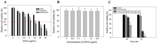 (A) Cytotoxicity of free DOX, GO-DOX and GOFA-DOX against MCF-7 cells. The cells were treated for 24 h. The relative cell viability was compared to the control without DOX. * p < 0.05 compared with DOX, # p < 0.05 compared with GO-DOX; (B) Viability of MCF-7 cells after incubated with different concentration of GOFA for 24 h. The relative cell viability was compared to the control without GOFA. * p > 0.05 compared with control; (C) Cell viability of MCF-7 cells after incubated with GOFA/HACPN and GOFA-DOX/HACPN at different DOX concentrations for 24 and 72 h. The control is cell culture medium. & p > 0.05 compared with control, * p < 0.05 compared with control, # p < 0.05 compared with GOFA-DOX/HACPN 0.001 mg/mL DOX. Data are presented as mean ± standard deviation (SD), n = 6.