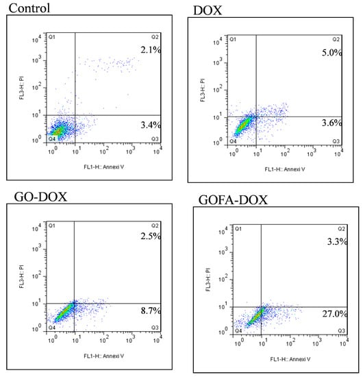 Doxorubicin is known as an anthracycline antibiotic effective in treating a variety of cancers. It functions primarily at the DNA level by blocking the replication and transcription processes [,]. DOX also activates damage-inducible DNA repair and prevent the triggering of programmed cell death by spontaneous and induced DNA damage []. To confirm the cytotoxicity of GO-DOX and GOFA-DOX toward MCF-7 cells was induced by apoptosis as of free DOX and compare the apoptosis ratio, Annexin V-FITC/PI staining assays was performed and the apoptotic and necrotic cells were quantified by flow cytometry. The percentages of necrotic (Q1), late apoptotic (Q2), early apoptotic (Q3) and live cells (Q4) are shown in Figure 8. The flow cytometry analysis revealed that early and late apoptosis represented the major death mode of MCF-7 cells, which was caused by free DOX or DOX released form GO (GOFA). The ratio of apoptosis cells treated with GOFA-DOX was 30.3%, compared with that of free DOX (8.6%). Most importantly, it is worth noting that the ratio of apoptosis cells treated with GOFA-DOX was markedly higher than that in cells treated with GO-DOX (11.2%), endorsing the targeting effect of FA. In general, the results of flow cytometry were consistent with the cell viability results by 3-(4,5-dimethyl-2-thiazolyl)-2,5-diphenyl-2H-tetrazolium bromide (MTT) assays (Figure 7A), underlining the importance of using GOFA to facilitate the entrance of DOX-loaded nano-carrier into the cells through endocytosis and subsequently release DOX that enters the nucleus to exert the cell cytotoxicity (Figure 5C,D). Furthermore, the FA-mediated intracellular uptake of GOFA could enhance the endocytosis of the nano-carrier to substantially increase the extent of cytotoxicity of DOX toward MCF-7 though cell apoptosis (Figure 5A,B).
