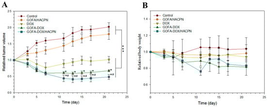 As shown in Figure 9A, the same trends of tumor growth were observed in the control group and the GOFA/HACPN group. The relative tumor volume increased rapidly during the treatment period and reached 2.17 ± 0.02 (control) and 1.79 ± 0.16 (GOFA/HACPN) at day 21 with no significant difference between groups. In contrast, the tumor growth rate was inhibited at different levels in all DOX-treated groups. The DOX, GOFA-DOX and GOFA-DOX/HACPN groups showed 0.82 ± 0.10, 0.67 ± 0.02 and 0.48 ± 0.07 relative tumor sizes at day 21, respectively, with significant difference among groups. Indeed, in vitro cytotoxicity results also endorsed the substantial enhancement of cytotoxicity of GOFA-DOX toward MCF-7 cells over free DOX at the same drug dosage (Figure 7A and Figure 8). Intratumoral injection of DOX showed associated cytotoxic effects only at the early stage of treatment and short-term inhibition of tumor growth. The tumor volume rapidly dropped as early as 3 days after treatment and lasted for 4 days, followed by a rebound phenomenon in tumor volume at the later stage of treatment. For the GOFA-DOX group, with the targeting effect of FA, DOX could be more efficiently delivered to MCF-7 cells and the relative tumor volume could be significantly reduced throughout the test period after day 7 and showed minimal recovery 7 days after treatment. Nonetheless, the most efficient cytotoxic effect and continuous inhibition of tumor growth was observed only in the GOFA-DOX/HACPN group where the tumor size was continuously reduced up to 11 days to resulted in the highest tumor inhibition ratio of 52% (based on tumor volume changes) after 21 days, suggesting the in vivo anti-tumor efficacy using a combinatory GOFA-DOX/HACPN intratumoral drug delivery platform. These results demonstrated that thermo-sensitive HACPN hydrogel loading GOFA-DOX for cancer in-situ treatment could lead to more extensive destruction of tumor tissues and enhance the therapeutic efficiency. The enhanced intracellular uptake of GOFA-DOX contributed to the higher tumor-killing ability when compared with the free DOX dosage form. For comparison with GOFA-DOX, in-situ forming HACPN thermo-sensitive hydrogel can be retained around the tumor tissue and slowly released GOFA-DOX in concomitant with hydrogel degradation, which could raise local DOX concentration in the tumor and enhance the topical bioavailability of DOX for the best antitumor effect toward MCF-7 cells.