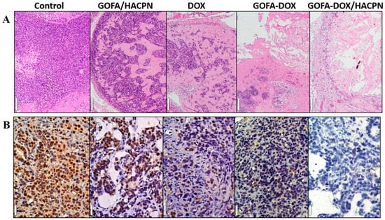 Improved tumor delivery of DOX should also inhibit proliferation of cancer cells. Immunohistochemical examination of tumor sections associated with the cell proliferation marker- proliferating cell nuclear antigen (PCNA) clearly indicated that a greater number of actively proliferating tumor cells existed in tumor sections from the control and the GOFA/HACPN groups. In contrast, the tumor treated with DOX and GOFA-DOX showed weak PCNA immunoreactivity. The PCNA expression was the lowest in the GOFA-DOX/HACPN group than other groups (Figure 10B). Therefore, we conclude GOFA-DOX/HACPN can provide effective anticancer activity to effectively inhibit proliferation of cancer cells [].
