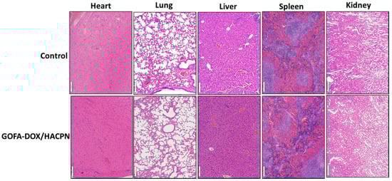 Histological examination of heart, lung, liver, spleen and kidney tissues by H&E stain after euthanization at day 21. Tissue biopsy did not reveal any observable differences between the control and the GOFA-DOX/HACPN group. Bar = 100 μm.
