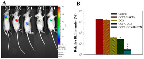 The bioluminescence imaging (BLI) of subcutaneously implanted MCF-7/Luc cells in nude mice. The BLI signal was measured at baseline (before treatment) and at day 21 after treatment. (A) Representative BLI obtained in the (a) control (saline), (b) GOFA/HACPN, (c) DOX, (d) GOFA-DOX and (e) GOFA-DOX/HACPN group by IVIS at day 21. (B) Plot of the relative BLI signal intensity at day 21 (mean ± SD, n = 6). The relative BLI signal intensity (%) was calculated from the total bioluminescent signal intensity at day 21 normalized by the total bioluminescent signal intensity at baseline. * p < 0.05 compared with DOX, # p < 0.01 compared with GOFA-DOX.