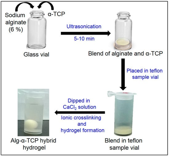 The hybrid gel of Alg and α-TCP particles was fabricated by ionic crosslinking as follows: Firstly, sodium alginate (0.3 g) and α-TCP particles (0.03, 0.15 and 3.0 g) were poured into 5 mL distilled water (pH 7.0) in a 25 mL glass vial (Figure 1). After that, the components were mixed using the ultrasonicator (Vibra Cell, Sonics, Gyeonggi-do, Korea) to get a homogeneous slurry [49]. Then, a definite volume of blend (0.3 mL) was kept in an 8 mL Teflon sample vial (d = 10.3 mm, Daihan Scientific, Seoul, Korea) and 0.1 M calcium chloride (CaCl2) solution was poured into the vial for ionic crosslinking. After that, the round shape gel was formed and taken out from calcium chloride solution. The gel samples were washed three times with distilled water (3 × 50 mL) to remove excess calcium ions present in the surface of the gel. Finally, the gel mass was dried in a lyophilizer (IL Shin Lab, Gyeonggi-do, Korea) for 48 h at −60 °C and used for further study.