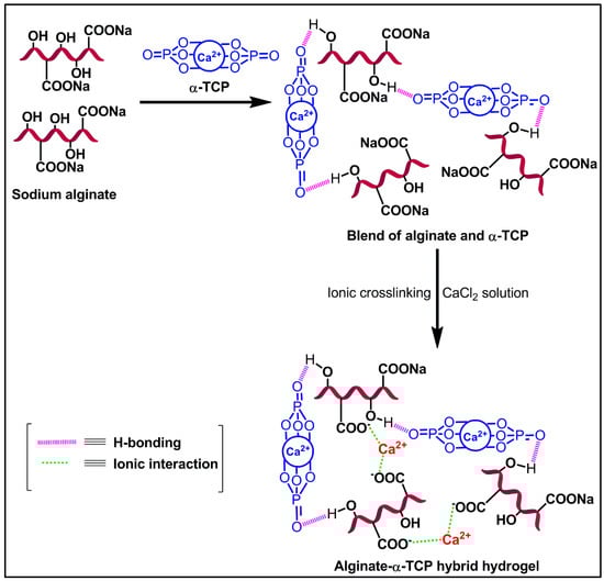 Schematic of probable reaction mechanism for Alg-α-TCP hybrid gel formation.