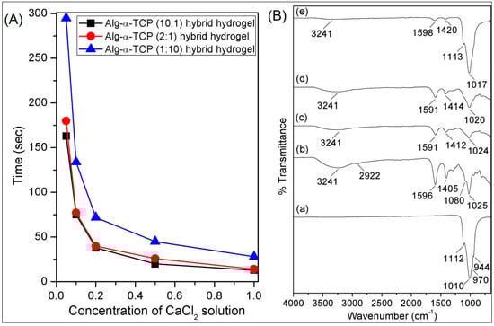 (A) Gelation time of Alg-α-TCP (10:1, 2:1 and 1:10) hybrid gels at different concentrations of CaCl2 solutions [M] and (B) attenuated total reflectance Fourier transform infrared (ATR-FTIR) spectra of dried (a) α-TCP, (b) sodium alginate and hybrid gel with different compositions (c) 10:1, (d) 2:1 and (e) 1:10.