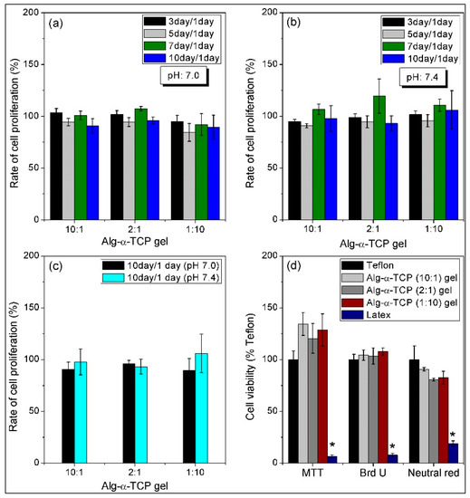 Rate of MC3T3 cell proliferation inside the Alg-α-TCP (10:1, 2:1 and 1:10) gels at (a) pH 7.0; (b) pH 7.4; (c) comparative study of cell proliferation at pH 7.0 and pH 7.4 after 10 days and (d) cytotoxicity of hybrid gels by the MTT, BrdU and Neutral red assays.