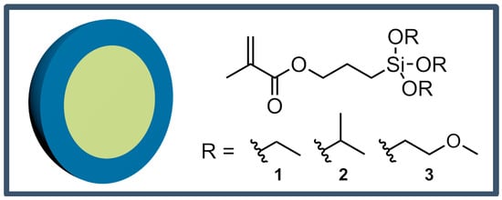 Starved-feed emulsion polymerization was carried out for the preparation of monodisperse hybrid core–shell particles. The chemical structure of the particles is given in Figure 1: poly(methyl methacrylate) (PMMA) or polystyrene (PS) core particles having a comparably soft shell material of copolymerized ethyl acrylate (EA) with different alkoxysilane-containing methacrylates, i.e., either 3-methacryloxypropyltriethoxysilane 1 (MPSEt), 3-methacryloxypropyltriisopropoxysilane 2 (MPSIsoprop), or 3-methacryloxypropyltris(methoxyethoxy)silane 3 (MPSMeEt).