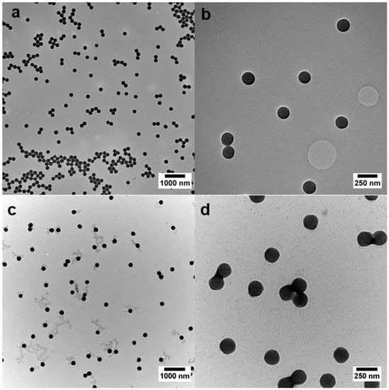 TEM Images of the P(MMA-co-ALMA) core particles (a,b) and the corresponding P(MMA-co-ALMA)@P(EA-co-MPSEt) core–shell particles (c,d). Scale bars correspond to 1000 nm (left) and 250 nm (right), respectively.
