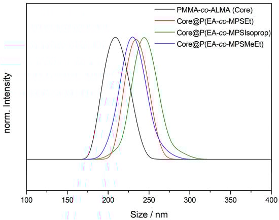 DLS measurement of the PMMA-co-ALMA core particles and subsequent steps of the core–shell particle synthesis with different poly(alkoxysilane methacrylate) copolymers with PEA as shell material.