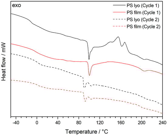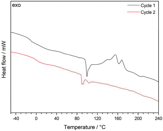 Differential Scanning Calorimetry (DSC) thermograms of PS-co-PALMA@P(EA-co-MPSEt) lyophilized particle powder with a heating rate of 5 K min−1 under nitrogen atmosphere.