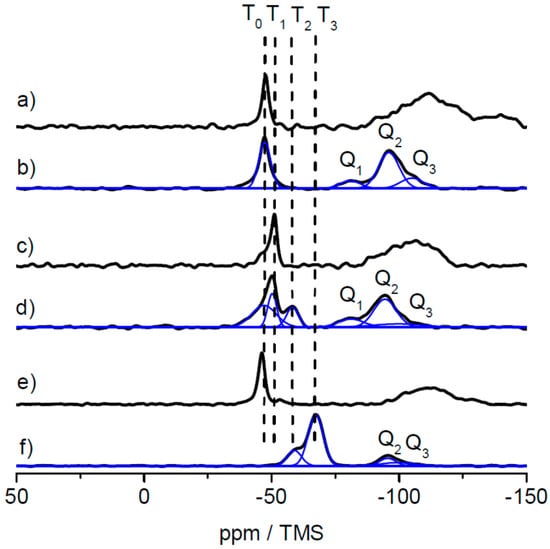 29Si static spectra of the free linkers MPSEt (a), MPSIsoprop (c) and MPSMeEt (e), and corresponding 29Si CP MAS spectra of the lyophilized powder samples prepared with these linkers (b,d,f). Note: the broad signal in the high field region of the static spectra refers to the rotor insert that was employed to handle the liquid linkers for static measurements with the solid-state NMR probe. The spectra of the lyophilized powder samples were deconvoluted to ease the signal assignment to different structural elements.