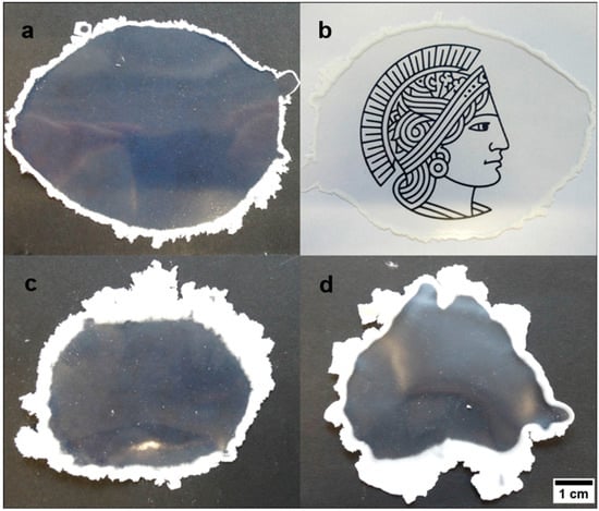 Photos for the particle-based films obtained after melt-shear organization at 140 °C, 180 bar, for 180 s. In detail, the core–shell particles consisted of a P(MMA-co-ALMA) core and a shell material consisting of the investigated siloxane-containing polymers, i.e., P(EA-co-MPSEt) (a,b), P(EA-co-MPSIsoprop) (c), and P(EA-co-MPSMeEt) (d). The scale bar corresponds to 1 cm.